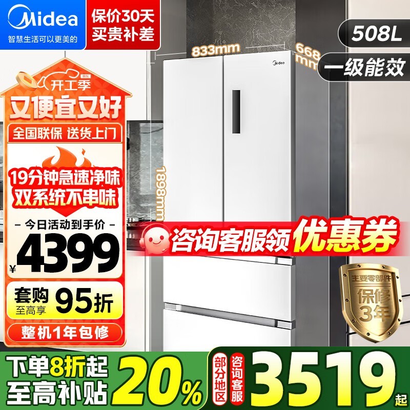 美的508升变频冰箱BCD-508WTPZM(E)锦缎白京东促销到手3759元