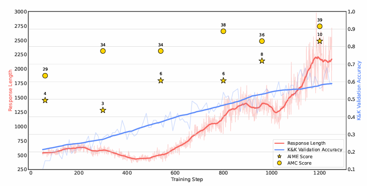 随着强化学习 (RL) 训练进行,各观测指标变化。红线是模型回答长度,蓝线是验证集准确率,黄色散点是两种域外 (OOD) 的数学竞赛正确率,三者均保持稳定增长趋势: