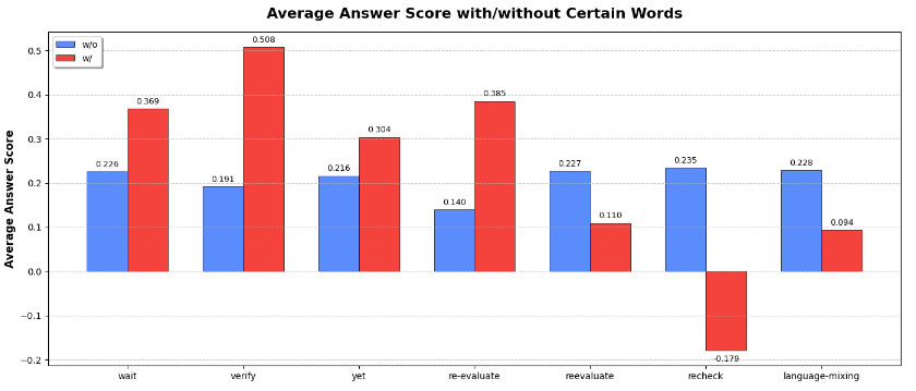 1. 当 "wait" "verify" "yet"(稍等,验证,然而)等等词出现的时候,推理性能明显更高。然而也有意想不到的情况:“recheck” 出现的时候,会导致推理分数下降,不是所有人们以为的思考词都能涨点。recheck 可能表示模型总是举棋不定,会更大概率犯错。