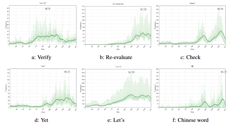 作者统计了训练过程中思考相关的各词频变化。RL 训练自然地提高了与反思相关词汇(如 verify, check)以及语气舒缓词(let's, yet, now that..)的频率。