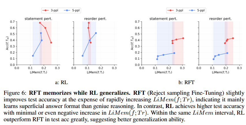 SFT 是在记忆分数 (横轴) 大幅增长的代价下,换取少量的测试集分数提高的;而 RL 几乎不增长记忆性 (甚至出现了负增长),而纵轴上的测试集分数快速增长。