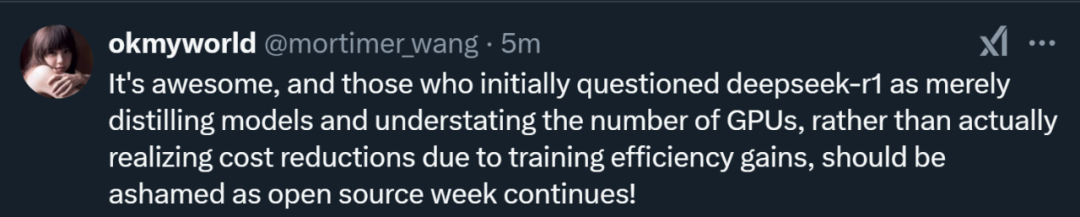 之前,有人曾质疑 DeepSeek-R1 只是通过模型蒸馏来实现其性能,而非真正的技术创新。还有人怀疑 DeepSeek 低报了训练所需的 GPU 数量。开源周发布的这些内容可以从某些角度证明,DeepSeek 确实通过技术创新实现了真正的训练效率提升和成本降低。