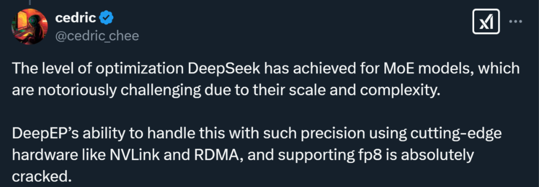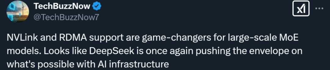 还有人说,「NVLink 和 RDMA 支持对大规模 MoE 模型来说是革命性的突破。看来 DeepSeek 再次在 AI 基础设施的可能性方面推动了技术边界。」