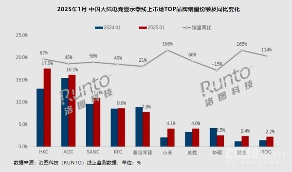 具体来看,HKC在1月的表现尤为出色,凭借17.5%的销量份额,稳居线上电竞显示器市场销量榜首,较去年同期提升了4.5个百分点,销量同比更是大幅增长了87%。AOC在线上市场的销量份额为16.1%,同比增长45%,但在1月暂时屈居第二。