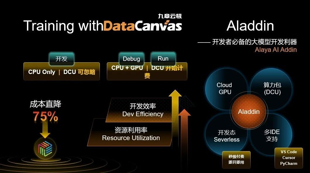 在大会论坛上,九章云极DataCanvas公司AI首席科学家缪旭博士受邀发表主旨演讲。他表示,“算力不应是少数企业的‘奢侈品’,而应成为开发者触手可及的‘日用品’。借助我们的大模型开发工具Aladdin,九章云极DataCanvas赋能开发者无缝使用云端GPU算力,一键开启大模型的远程开发、调试和微调,算力使用成本直降75%,实现开发效率和资源利用效率的双效突破。”
