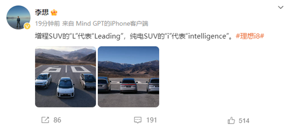 李想称:增程SUV的“L”代表“Leading”,纯电SUV的“i”代表“intelligence”。