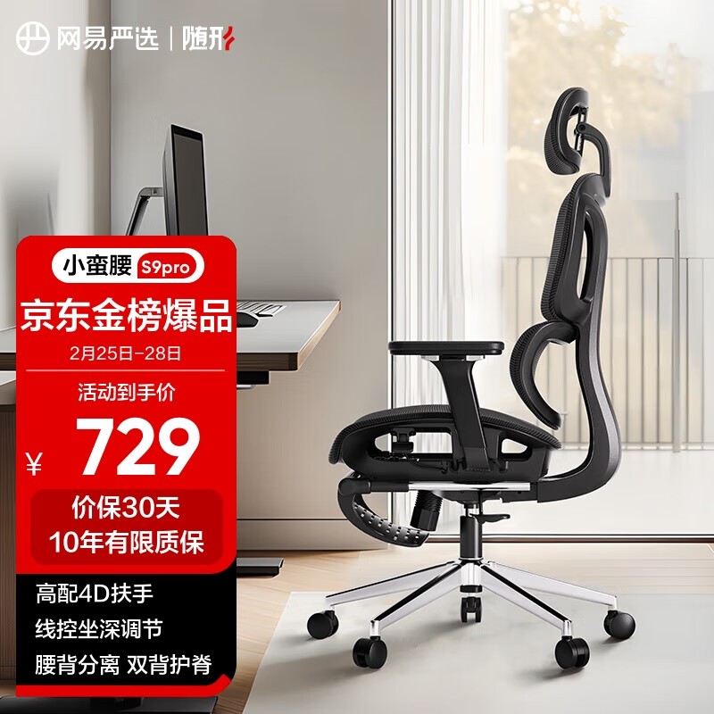 网易严选小蛮腰S9 Pro电脑椅黑色带搁脚款535元包邮