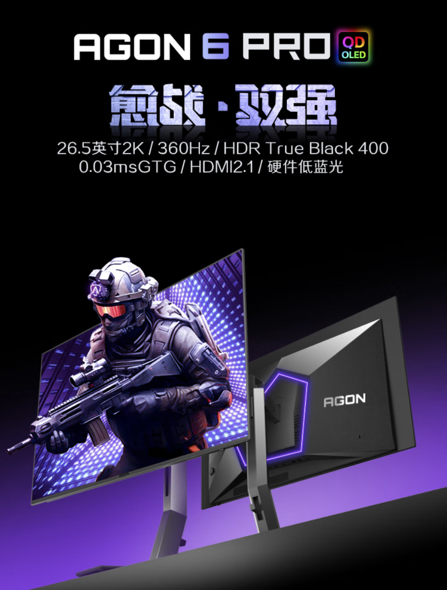 作为AGON最新发布的QD-OLED显示器,它不仅拥有QHD的分辨率以及360Hz的超高刷新率,更拥有1000nit的峰值亮度,搭配低至0.03ms的GTG灰阶响应时间,不论是在游戏还是日常应用中都能够拥有更疾速的画面表现。为此它还获得了HDR TrueBlack 400认证和VESE ClearMR18000认证,这代表着它不仅拥有高动态影像解析能力,而且在高动态影像中清晰像素占比达到模糊像素的180多倍,一定程度上增强了图像的质量表现。