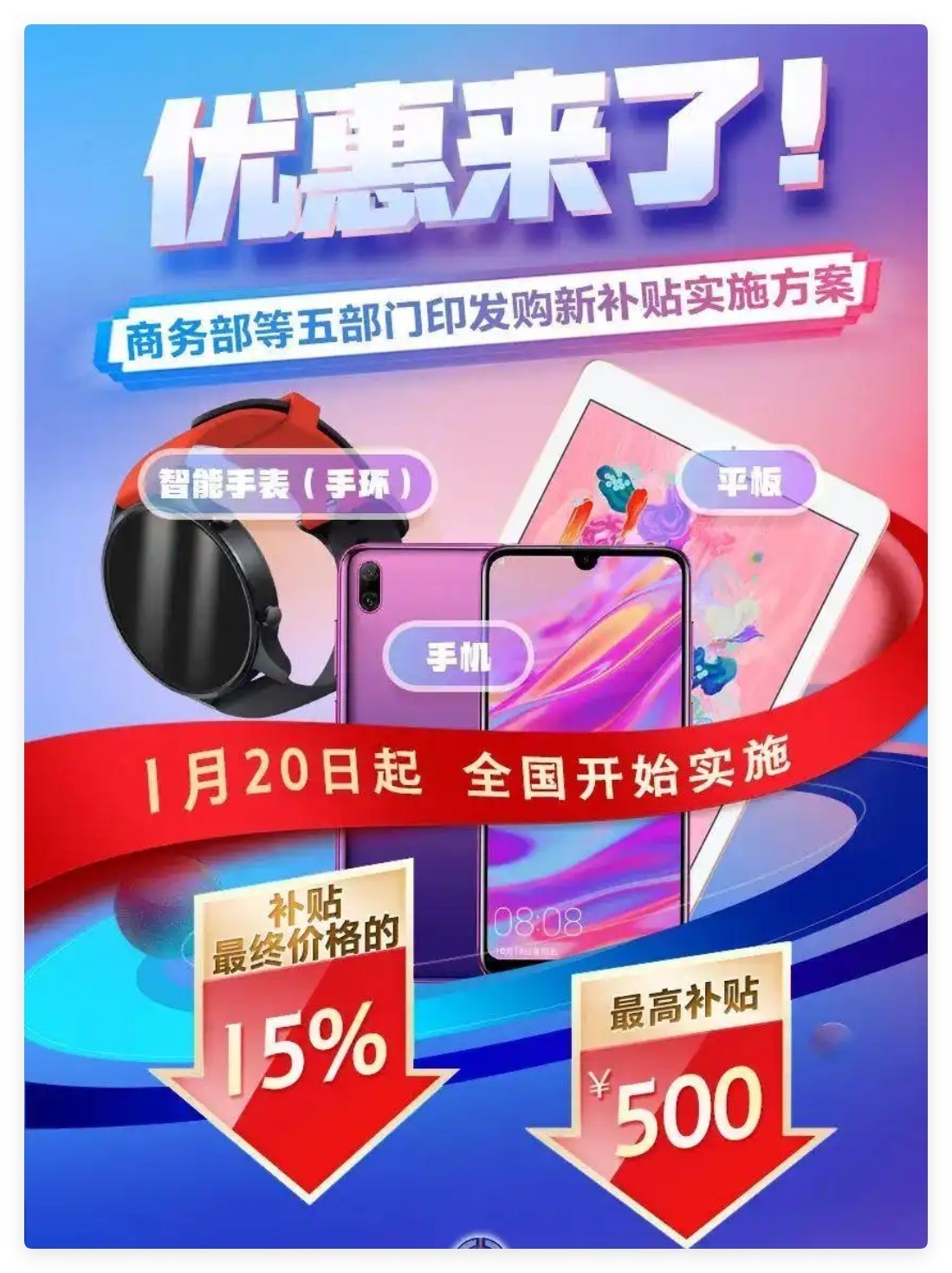 手机、平板、智能手表 / 智能手环三类中销售价格(指减去优惠后的实付价格)不超过 6000 元的部分商品可参与本次补贴。