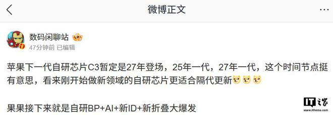 2 月 24 日消息,博主@数码闲聊站 今日发文透露,苹果下一代自研芯片C3 暂定是 27 年(此处预计指 2027 年)登场。另外,博主表示苹果“接下来就是自研 BP+AI + 新 ID + 新折叠大爆发”。