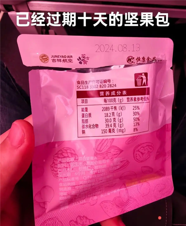 而此前报道显示,网友分享的图片显示,吉祥航空发放的坚果零食包包装袋上写有“吉祥航空”字样,生产日期为“2024年8月13日”,保质期则为“6个月”,网友称已过期十天。
