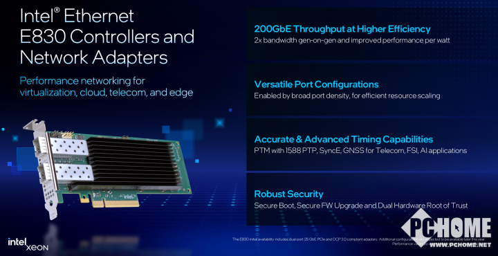 ·灵活的端口选择:英特尔以太网E830产品提供1x200GbE、2x100/50/25/10GbE和8x25/10GbE等端口配置,让企业能够定制网络基础设施,满足特定的性能与成本需求。