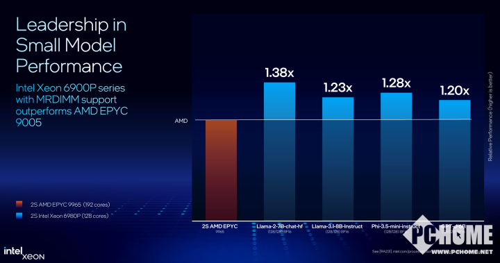 在Llama 2-7B、Phi-3.5等多个小参数量的大预言模型中,支持MRDIMM内存的双路128核心至强6980P处理器的性能比AMD的双路192核心EYPC 9965处理器性能更优,最多可领先38%。