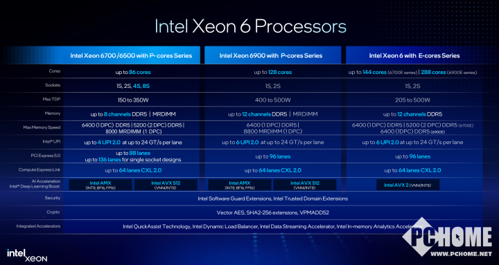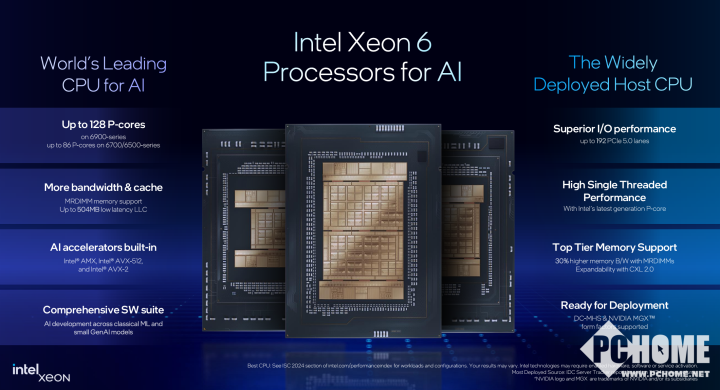 至强6性能核处理器采用模块化SoC架构,由Intel 3制程的计算芯片单元和Intel 7制程的I/O芯片单元组成,搭配全新封装技术带来更出色的可扩展性和灵活性。与去年推出的至强6 6900性能处理器最高128核心相比,至强6700/6500系列性能核处理器最高拥有86个性能核心,支持单路、双路、四路与8路设计,TDP为150瓦到350瓦。