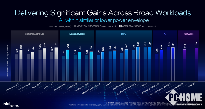 根据英特尔公布的性能数据,拥有86核心、TDP 350瓦的至强6787P对比64核心、TDP 350瓦的至强8592+在通用计算、高性能计算、AI、网络等众多业务中可提升超过50%。