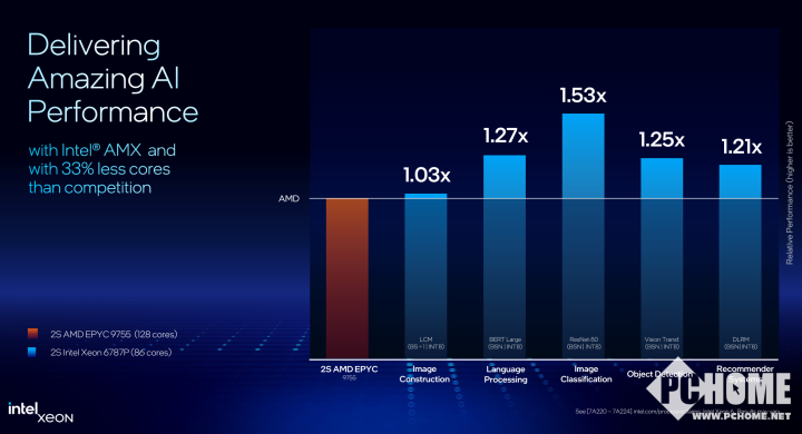 对比128核心的双路AMD EPYC 9755处理器,英特尔双路至强6787P在多个AI负载方面最多可领先达50%以上。