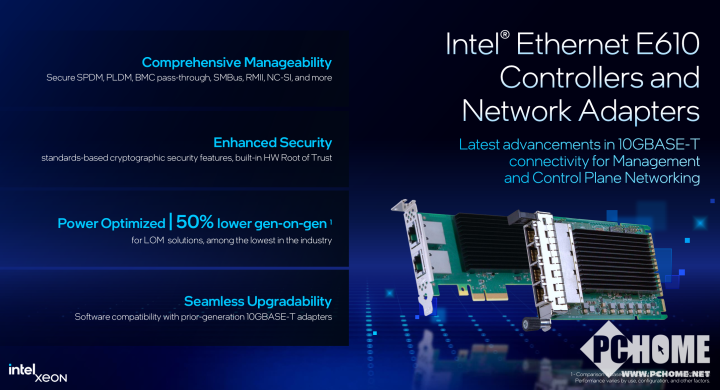 ·出色的能效表现:与上一代产品相比,英特尔以太网E610产品功耗降低达50%,在助力降低运营成本的同时最大限度减少对环境的影响。