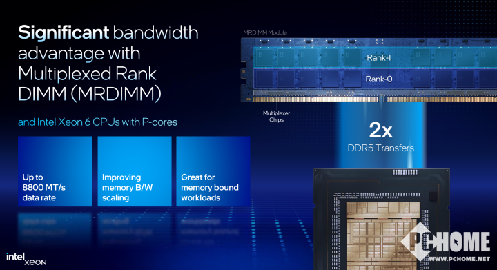 内存方面,最高支持8通道DDR5,并且支持MRDIMM(多重存取双列直插式内存模组)。相比至强5的内存规格4800-5600MT/s,至强6性能核处理器最高可以支持到8800 MT/s的频率,对比已经在数据中心部署的产品提升达到50%以上。