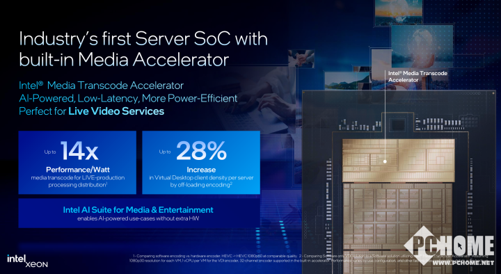 此外,至强6是首款内置媒体加速器——英特尔媒体转码加速器的服务器SoC,相较于英特尔至强6538N处理器,每瓦性能提升高达14倍。