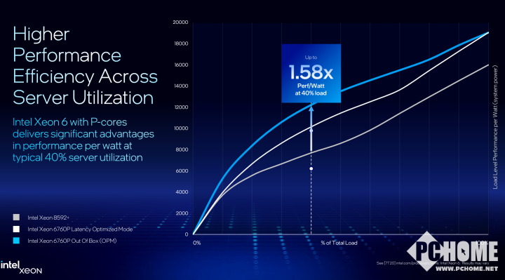 至强6处理器还具备出色的每瓦性能效率,在40%的负载下,至强6760P对比至强8592+的能效提升可以达到58%。以5年使用周期计,平均可以实现以一台新的服务器替代五台旧服务器,在某些用例中该比例可达10:1,从而节省高达68%的总体拥有成本(TCO)。