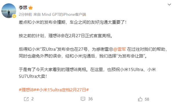 李想还称,按之前的计划,理想i8会在2月27日正式官宣亮相,后得知小米“双Ultra”发布会也在27号,为感谢雷总在过往对我们的帮助,同时也避免外界的误会,经和小米沟通后,我们选择“为发布会让路”。