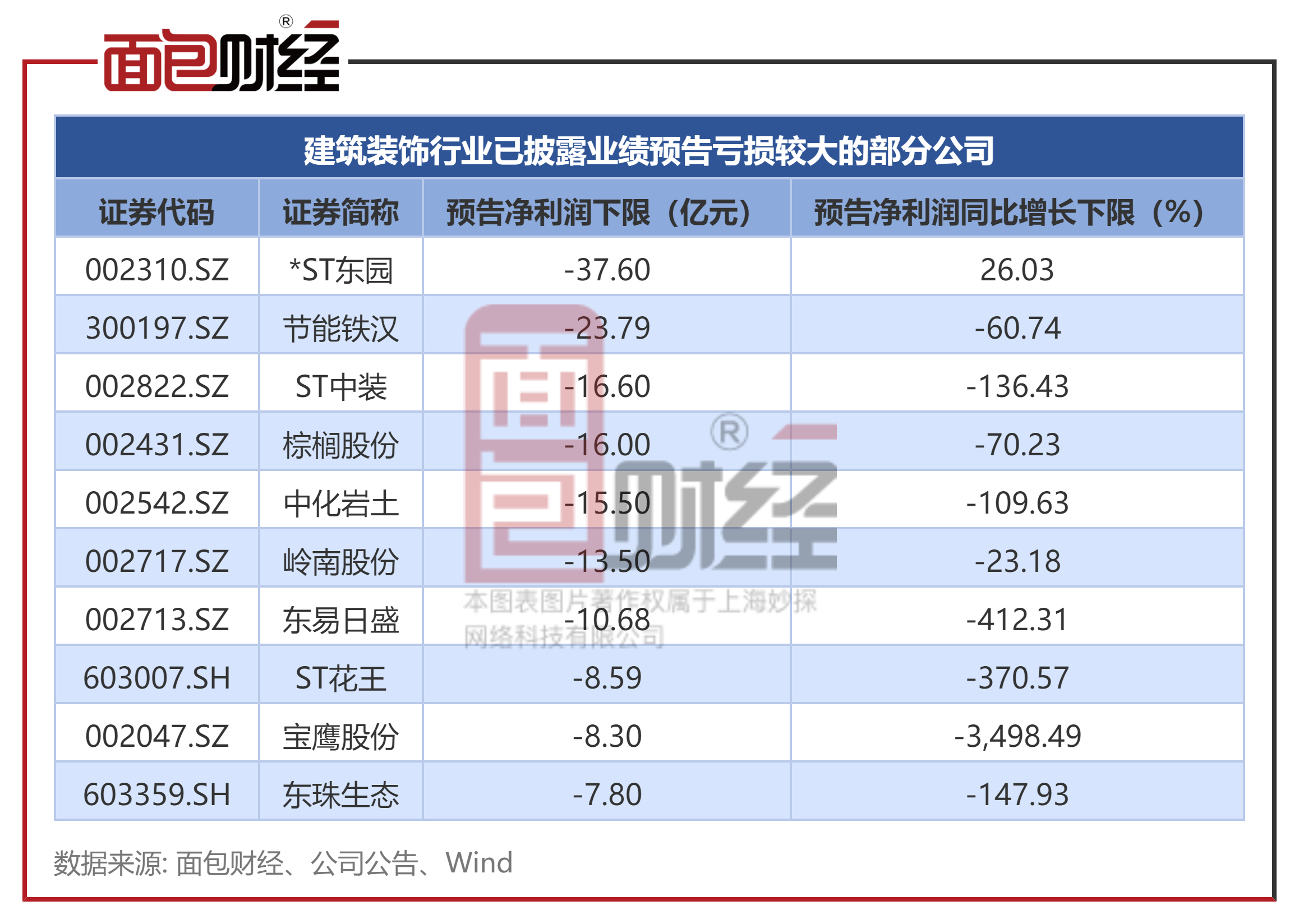 统计数据显示,建筑装饰行业所有公布业绩预告的公司中有60家亏损。其中,预告净利润下限排名前三位的公司分别*ST东园、节能铁汉及ST中装。