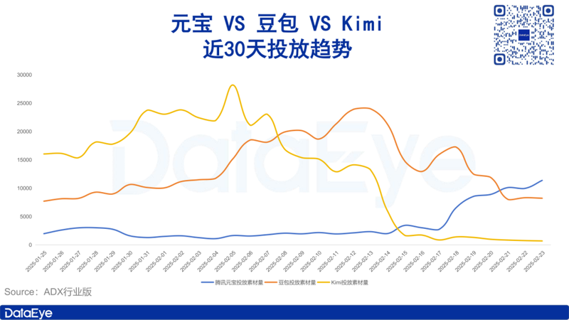 ADX数据显示,2月5日之前,Kimi、豆包与腾讯元宝投放素材量分层明显,且存在不小差距。