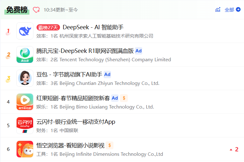 这段时间内,腾讯元宝版本更新频繁,2月22日新版本已支持上传及拍照识图,在产品、投放多重因素引导下,元宝正式超越豆包,成为大陆地区苹果端免费APP下载榜第二名。