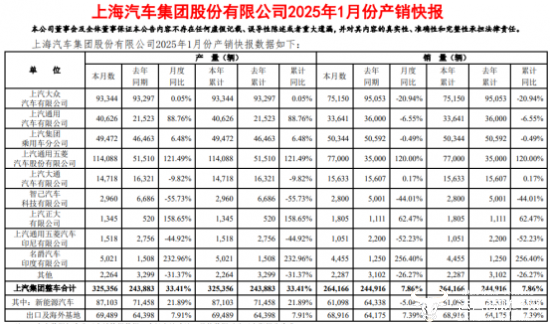 而据上汽集团最新一期的产销快报显示,2025年1月份,上汽集团的产销量均实现增长。具体来看,该月上汽集团的产量为32.5万辆,同比增长33.41%;销量为26.4万辆,同比增长7.86%。