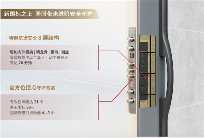 艺术与精湛工艺的加持之下,维尔德与维尔德Pro系列更以创新科技提升守护的深度,为居者构筑安全屏障。门体内部精心打造8层防护结构,构筑无惧破坏的“铜墙铁壁”,21个锁点分布,以高于国标的防护等级为家居安全提供全方位保障。在安全之外,盼盼安全门使用全水发泡填充技术,让门体兼具楼板级的隔音性能,有效阻隔外部噪音;同时,盼盼安全门通过欧美UL环保认证,严格执行0甲醛环保标准,在安全与健康之间,达到双重保障。
