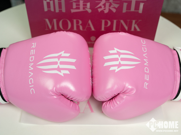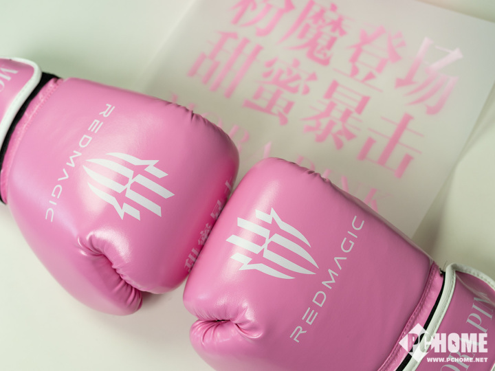 今天,我们编辑部收到了一份特别的礼物,这个大盒子写上了“粉魔登场,甜蜜暴击”,打开后是一副粉色的拳套,就是粉色的配色有些奇怪,毕竟拳套与这种配色实在有些不搭。