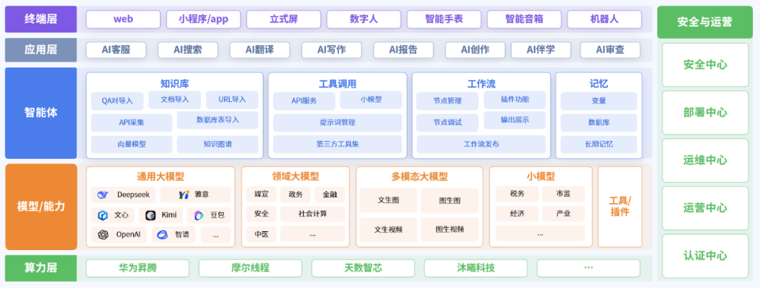 智川X-Agent平台采用算力、模型、智能体、应用、终端五层架构,集成知识库管理、工具调用、工作流编排和记忆等能力,致力于提升企业灵活需求下AI应用的开发效率。