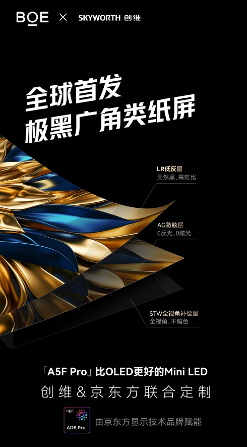 创维“黑骑士”A5FPro的核心亮点之一是其与京东方联合研发的极黑广角类纸屏。这项技术是电视行业首个融合了LR低反层、STW全视角补偿层和AG防眩层三大屏体技术,官方宣称实现了比OLED电视更出色的显示效果。具体来说,LR低反层能够提供天然黑和百万级动态对比度,暗场细节表现媲美OLED;STW全视角补偿层则确保了178°广视角下色彩无偏移,解决了电视侧视偏色的问题;而AG防眩层则实现了0反光0眩光,打破了OLED“镜面屏”的局限,即使在强光环境下,画面依然清晰透亮。