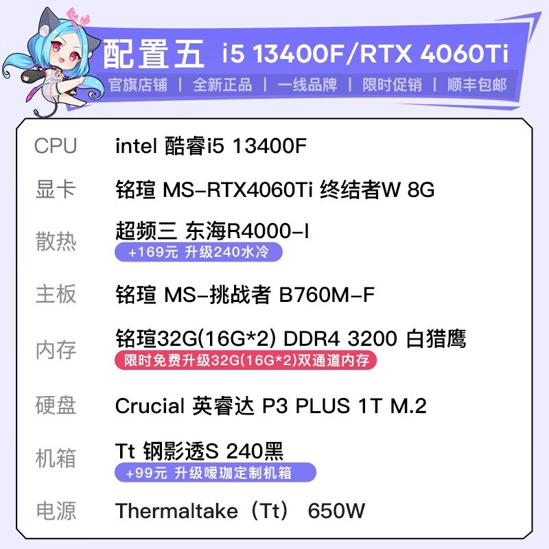 铭瑄挑战者13400F/4060Ti主机限时特惠5199元免费升级32G内存