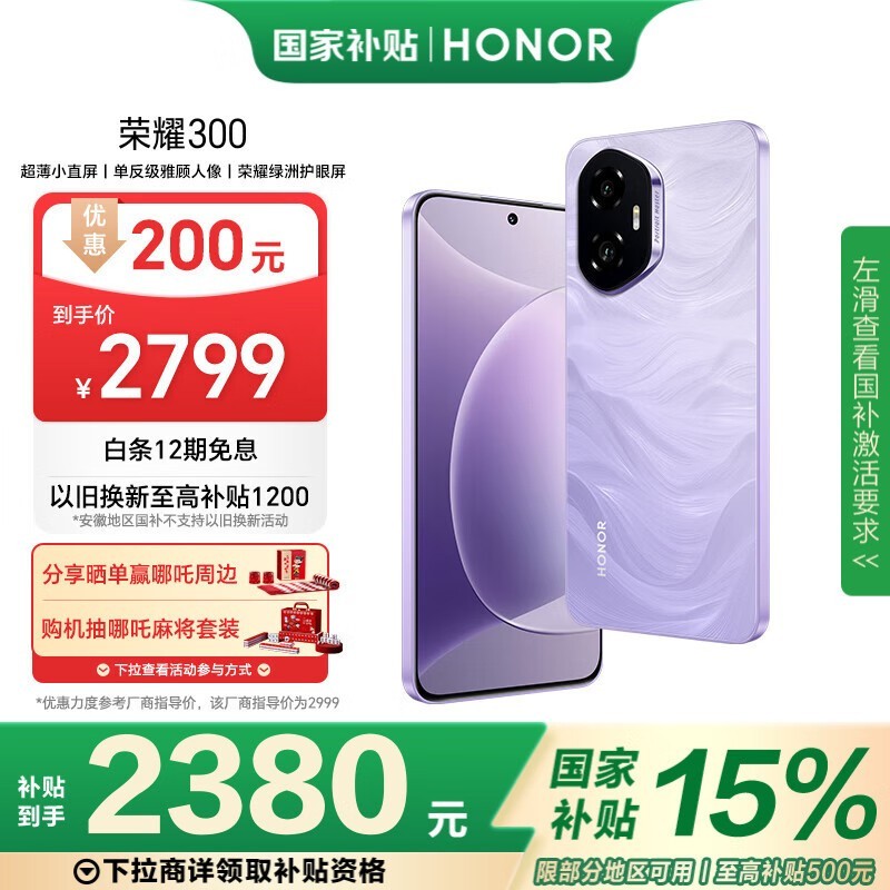 荣耀HONOR 300 5G手机庐烟紫16GB+512GB京东活动价2209元