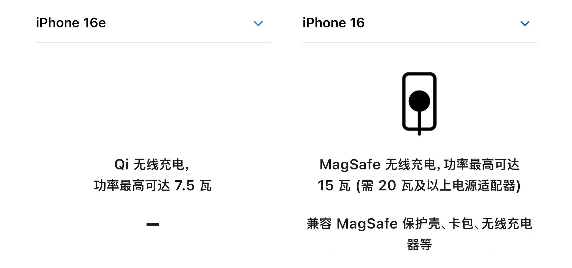 充电也砍了一刀,iPhone 16e把MagSafe砍掉了,虽然也能无线充电,但不支持磁吸充电器了。此外,无线充电的功率也从15W砍到了7.5W。
