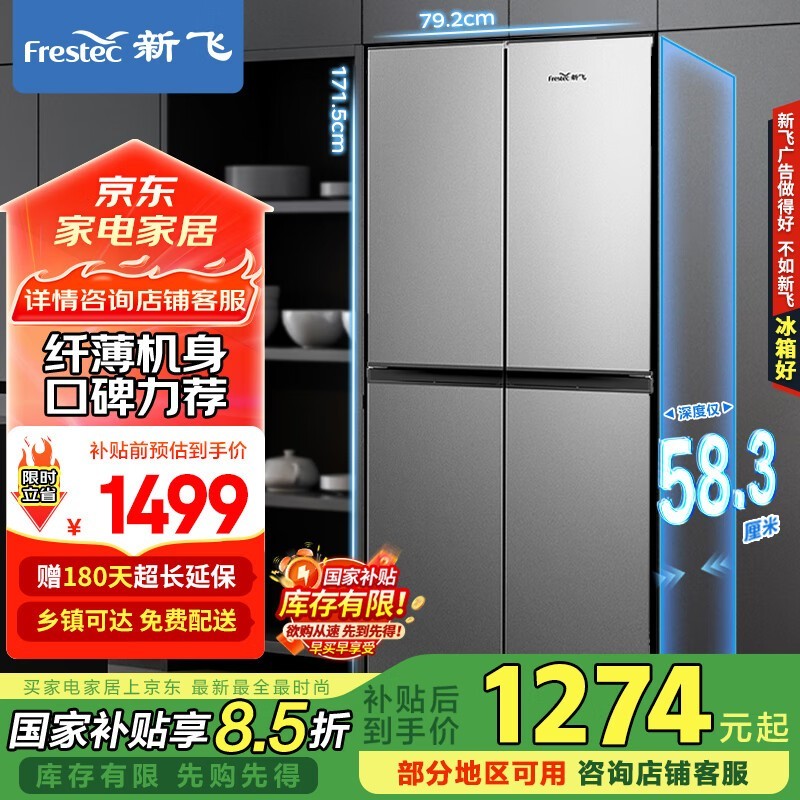 新飞382L十字对开门冰箱银色保鲜节能省电促销