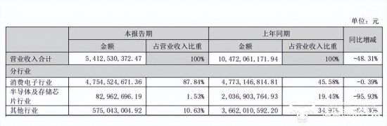 而半导体业务只有8296万元,占营收的1.53%,但较上年同期却下滑95.93%。