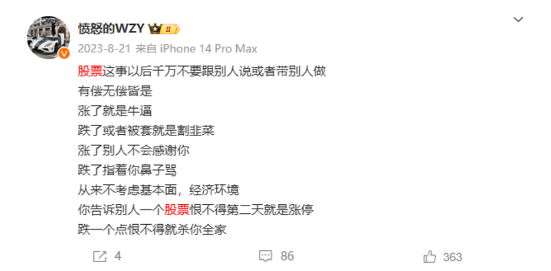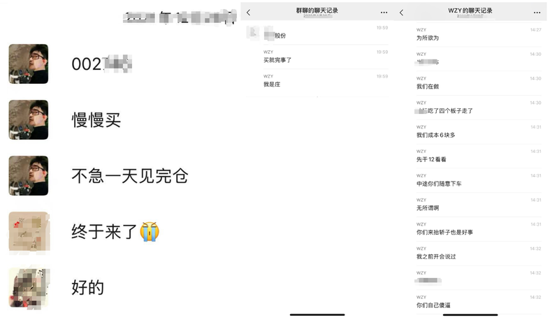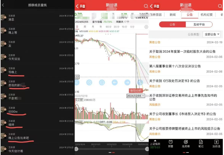 后来王政源又推了几只带帽的股票。“有些亏红眼的人到后来心态已经失衡了,即便心里不那么信他也还是想去试一试。” 投资者老吴透露。其中,王政源曾宣称某股票即将公布“5000万增持”的消息,当晚这支股票被停牌。退市那晚,有群友抽了一晚上的烟,不知道怎么跟家人交代。