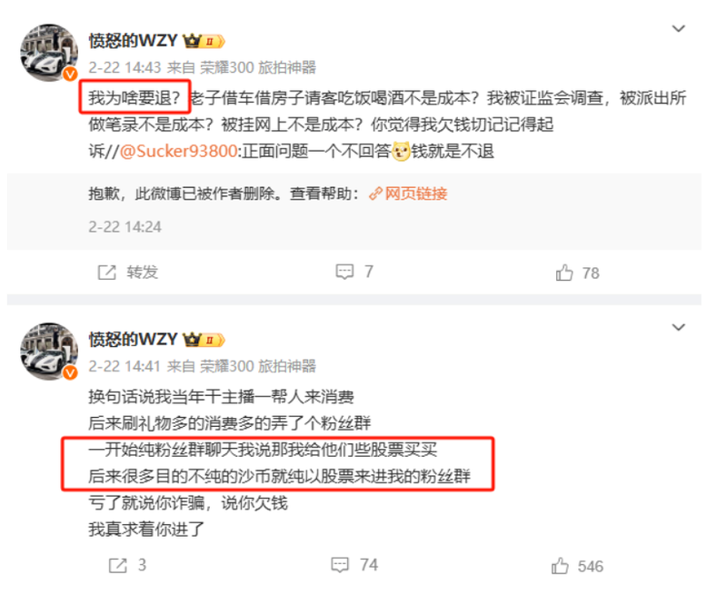 此事拉扯多年。近日舆论发酵后,王政源在社交平台回应称:一开始纯粉丝群聊天我说那我给他们些股票买买,后来很多目的不纯的沙币就纯以股票来进我的粉丝群。“亏了就说你诈骗,说你欠钱,我真求着你进了。”