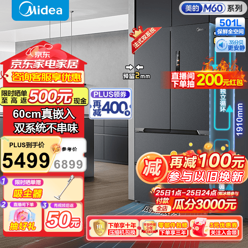 美的MR-526WUFPZE法式多门冰箱501L云朵系列静音节能省电