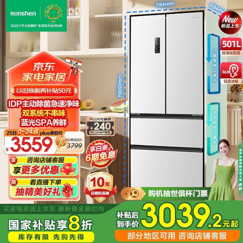 容声501L法式四开门冰箱双净系列京东特惠2623元到手