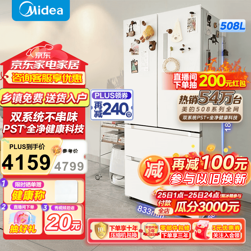 美的508L法式多门冰箱BCD-508WTPZM(E)莫兰迪灰京东特惠