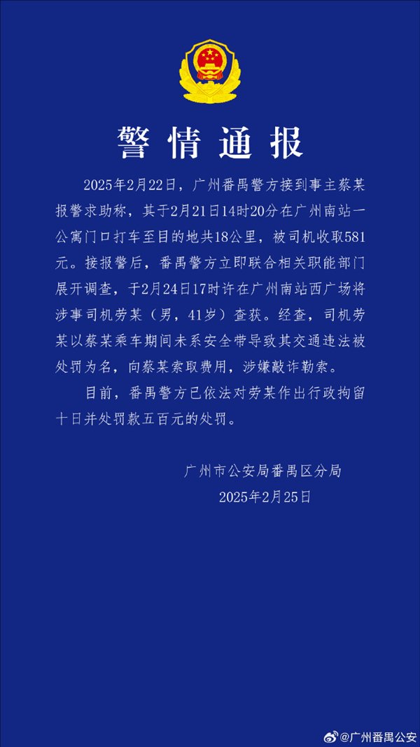2025年2月22日,广州番禺警方接到事主蔡某报警求助称,其于2月21日14时20分在广州南站一公寓门口打车至目的地共18公里,被司机收取581元。