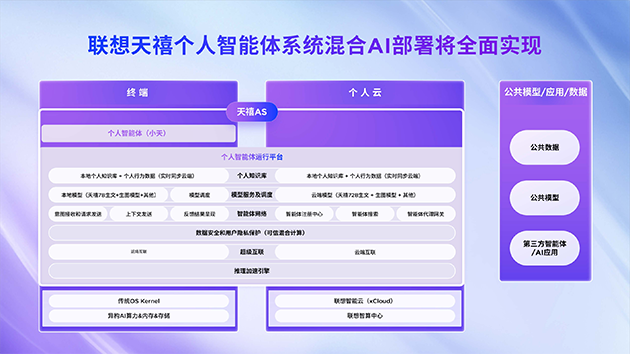 联想集团高级副总裁、中国消费业务群总经理 张华联想集团高级副总裁、中国消费业务群总经理张华透露,天禧AS将持续升级,今年5月,联想创新科技大会TechWorld上,天禧AS将首发基于个人云部署的DeepSeek大模型。他表示:“届时联想天禧AS,在端侧个人大模型、个人云大模型、公有云大模型,全面深度融合DeepSeek。联想天禧AS将实现创新的混合式AI部署,聚焦推动个人智能和企业智能的普惠。”这一混合式AI架构将整合公有云大模型的能力,结合异构算力、数据安全,及全栈解决方案,实现关键AI场景应用,加速落地并规模化。