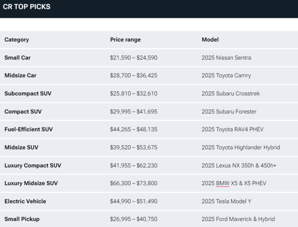 美媒《消费者报告》公布2025十佳车名单 日系依旧霸榜