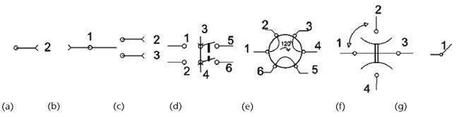 图 2. 开关配置:单刀单掷(a)、双刀单掷(b)、单刀双掷(c)、双刀双掷(d);旋转转换 3x120 [1 - 2; 3 - 4; 5 - 6 或 2 - 3; 4 - 5; 1 - 6](e)、旋转三位置开关 [1 - 3 或 1 - 4; 2 - 3 或 2 - 4](f)以及单刀四掷(g)