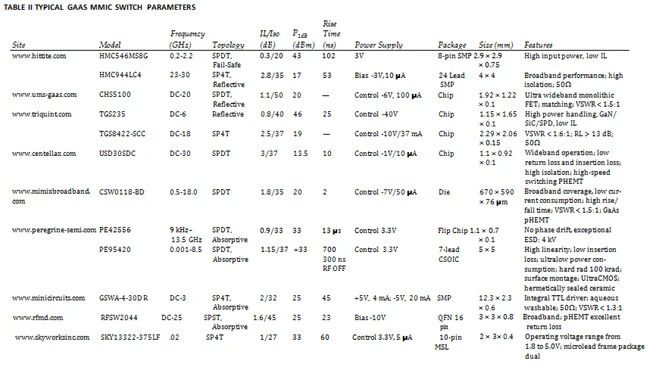 表 1 展示了一些采用 PIN 二极管技术的开关型号的典型参数。