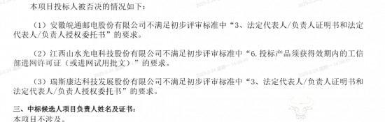 此外,有三家厂商在初步评审中即被否决,分别是安徽皖通邮电股份有限公司、江西山水光电科技股份有限公司和瑞斯康达科技发展股份有限公司。不知道三家厂商的负责人怎么看?