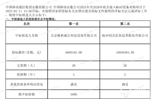 不过,由于项目有效投标人不足4人,最终只有1个中标名额。这意味着杭州初灵信息遗憾出局,北京格林威尔凭借较低报价成为本次最大赢家。